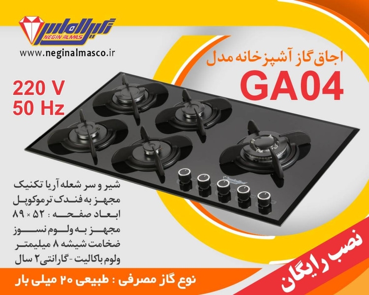 GA04 اجاق گاز نگین الماس ابعاد 89×52 شبکه رویه چدنی با لعاب سه لایه و پنج شعله مجهز به میکرو سوئیچ و ترموکوپل تاپ تایم مجهز به فندک اتومات دارای ولوم های نسوز فلزی باکالیت دارای سیم های نسوز و مگنت اسپانیایی شیشه های مقاوم و هشت میل بوبین ORKli اسپانیا