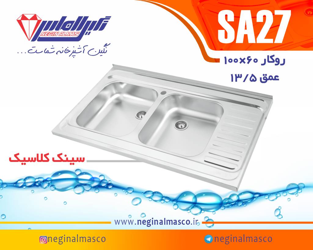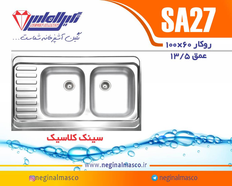ابعاد سینک : 100*60سانتی متر نوع سینک : روکار تعداد لگن : دو لگن عمق لگن : 13.5 سانتیمتر گارانتی : 120ماهه شرکتی